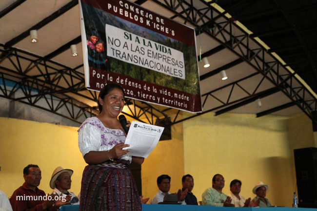 Lolita Chávez, coordinator of the K’iche’ People’s Council (Consejo de Pueblos K’iche’s, or CPK, in Spanish), reads the municipal act number 62-2010, official document that ratifies the plebiscite. The CPK belongs to the Western People’s Council, or Consejo de Pueblos del Occidente in Spanish. This umbrella organization spans several departments in the Guatemalan western highlands and defines itself as a “space where the original peoples of the region can summon local support for relevant struggles and gather their own representatives with the final purpose of strengthening and articulating efforts in response to common issues that affect local communities.” (2)